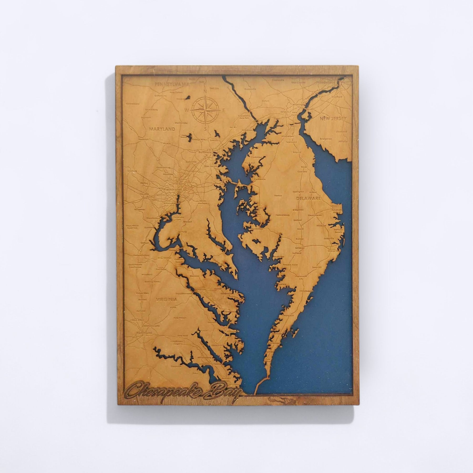 Bring the beauty and depth of the Chesapeake Bay into your home with this stunning laser-cut wooden map. Crafted from multiple layers of precision-cut wood, this framed artwork showcases the shoreline and water of the Bay, as well as a map of the surrounding areas, in an elegant dimensional layout. The layers add texture and contour, giving the piece a striking 3D effect that pays homage a truly unique landscape.